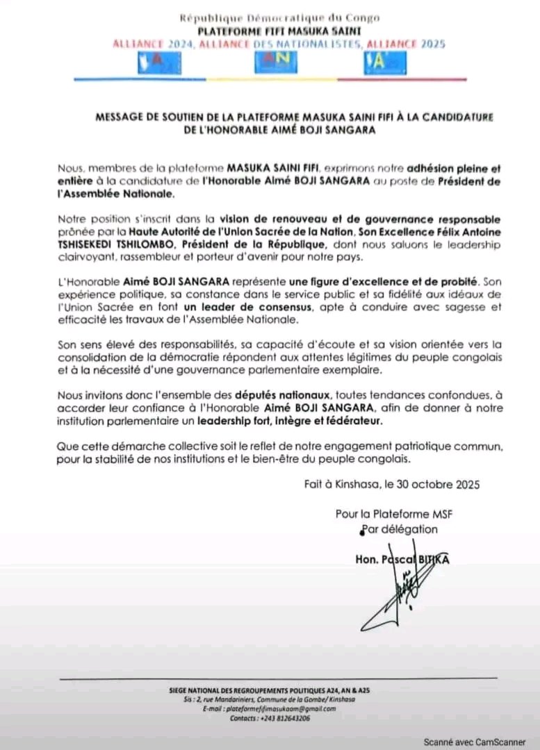 Dans une correspondance parvenue à la rédaction de PRIMEURACTU.CD le vendredi 31 octobre 2025, la plateforme de Fifi Masuka apporte son soutien à la candidature d'Aimé Boji Sangara au poste de président de l'Assemblée nationale de la République démocratique du Congo.