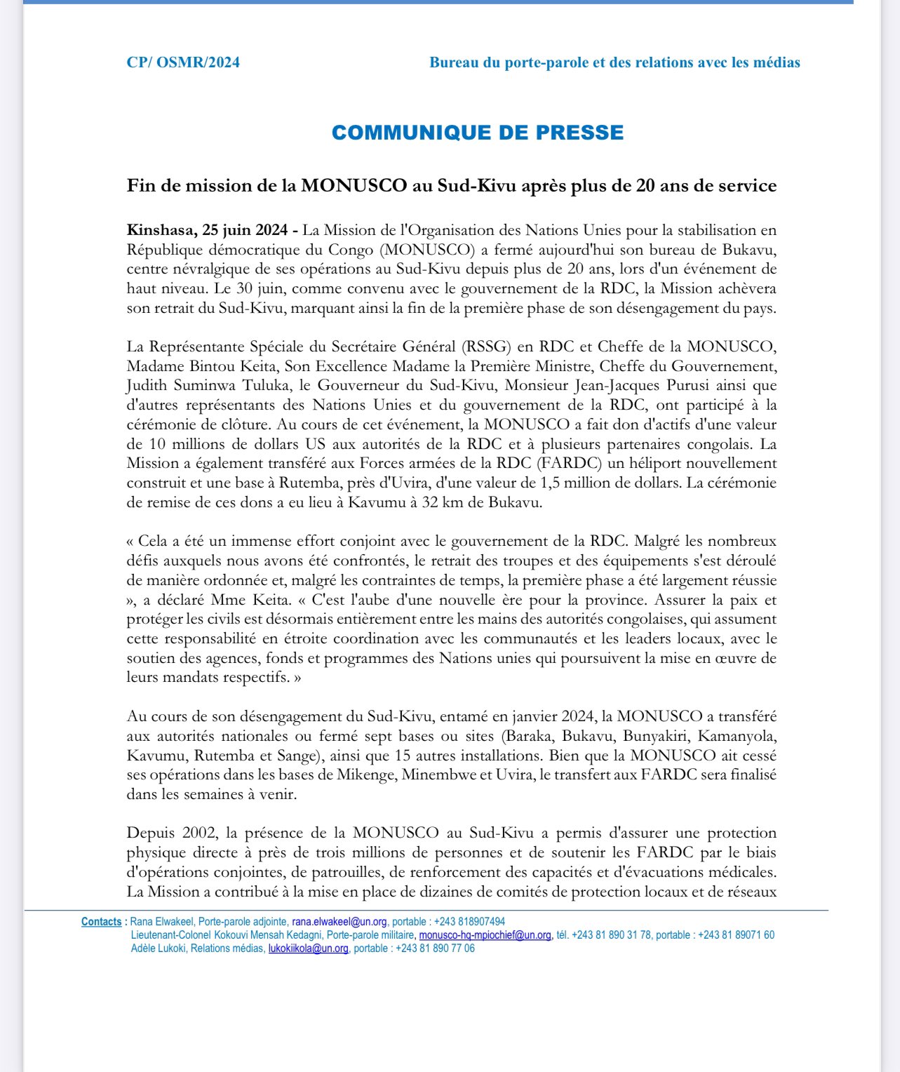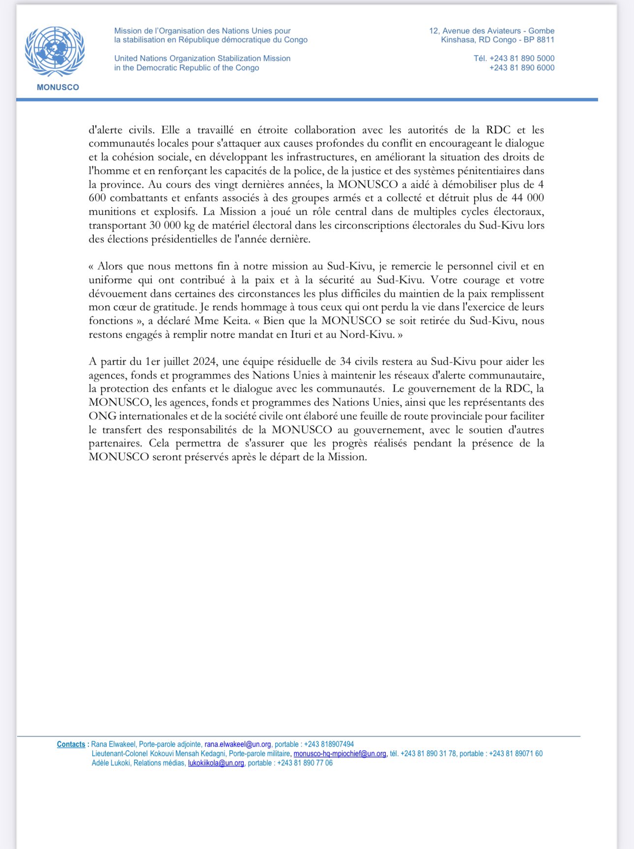 À en croire ce document, la mission onusienne achèvera, comme convenu avec le gouvernement Congolais, son retrait du Sud-Kivu, le 30 juin prochain.